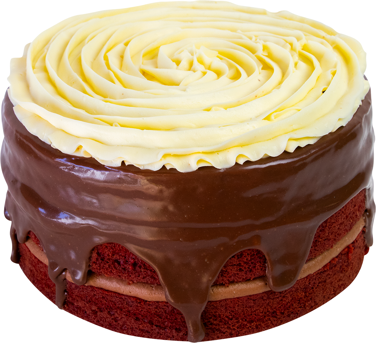 Pan sabor cacao, relleno de crema de avellana, betún de queso crema y chocolate chorreado.